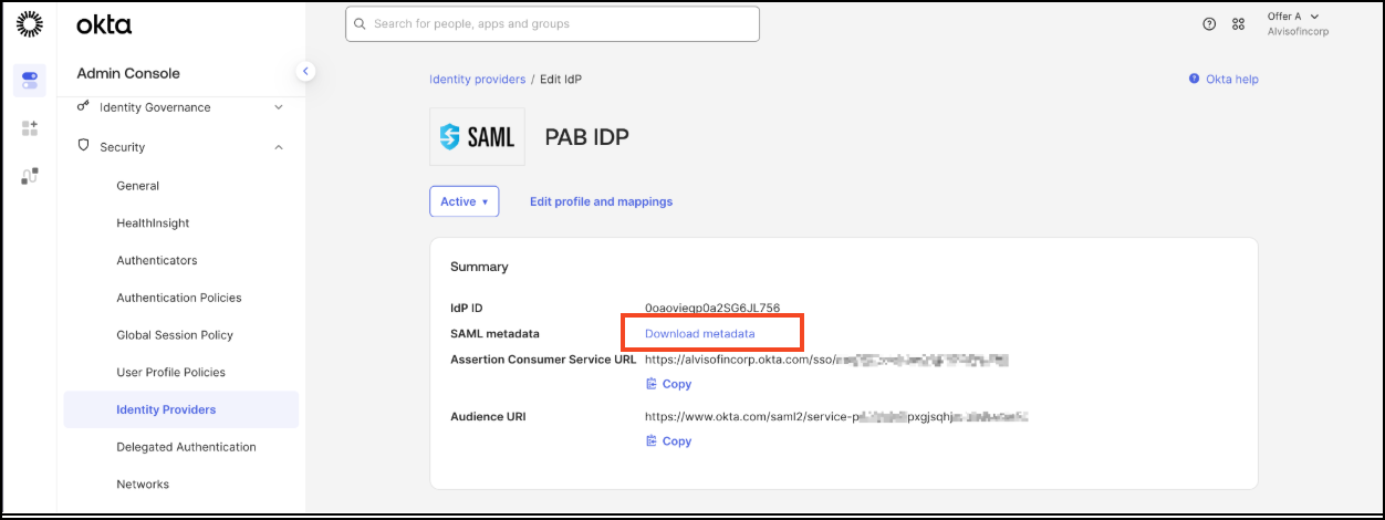 3. Configure the Prisma Access Browser as an IdP. For more information, refer to Add a SAML Identity Provider.