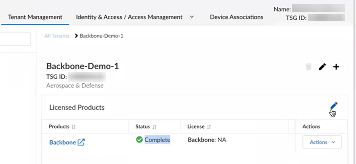 After you activate a license for SASE 5G, you can edit it from Tenant Management.- Use one of the various ways to access Common ServicesTenant Management.Search or scroll to the tenant where you activated the SASE 5G license.Edit the licensed product for the SASE 5G or Prisma Access.