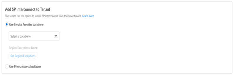 - Use Service Provider backbone to use internet service provider backbones for Prisma Access egress traffic, such as: BT, Orange, AT&T. Choose one of the backbones that you configured.