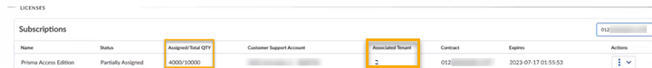 Choose the same Customer Support Account number that you used to activate the license.Choose the default Cloud management for your setup and management method.Specify a different tenant where Prisma Access is not already allocated.Select a Region nearest to the storage location of the data logs.Revise the current quantity of mobile user (MU) and remote network (RN) licenses allocated to the new quantity. The quantity available is based on the remainder after first-time allocation.Revise the existing Strata Logging Service log storage allocated to the new quantity.Agree to the Terms and Conditions.Activate Now. The revised quantities display in Subscriptions & Add-ons.You still see the status of partially assigned, the newly assigned quantity compared to the total quantity, and the increased number of associated tenants since the license is now shared between multiple tenants.