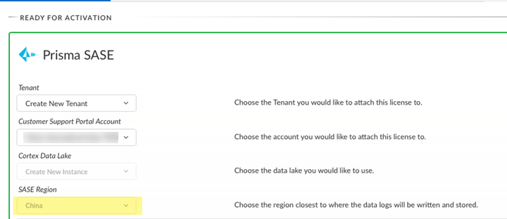 Select Create New Tenant from the tenant drop-down to create the tenant that you want to use for this license.Choose the Customer Support Portal account number that you want to use to claim the license. This is limited to CSPs that are associated with Prisma Access China.Select Create New Instance to create the Cortex Data Lake that you want to use for this license.China is selected by default to create the SASE Region for the logs.