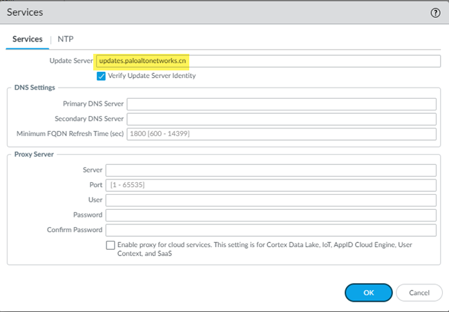 Select Cloud Identity Engine regardless if you intend to use it now or if you might use it in the future.Agree to the Terms and Conditions.Activate Now. The products and add-ons that you are activating (such as Prisma Access China or Strata Logging Service) are now provisioned. As the subscriptions are activating, the progress status will display. You now have a tenant provisioned with instances of the products that you purchased. The tenant has one user — the Customer Support account that you used when you began this process.After the provisioning is complete, you receive an email confirmation.In the Serial Number field of the Panorama web interface, enter the serial number that you copied from the license activation page, and then select OK.Panorama will become unresponsive after you select OK. If it does not return after a few minutes, refresh your browser.Change the Panorama update server location to the update server in China.- In Panorama, go to PanoramaSetupServices and click the gear to edit the Settings.Change the update server to updates.paloaltonetworks.cn.Update the DNS servers and NTP servers to the servers of your choice.