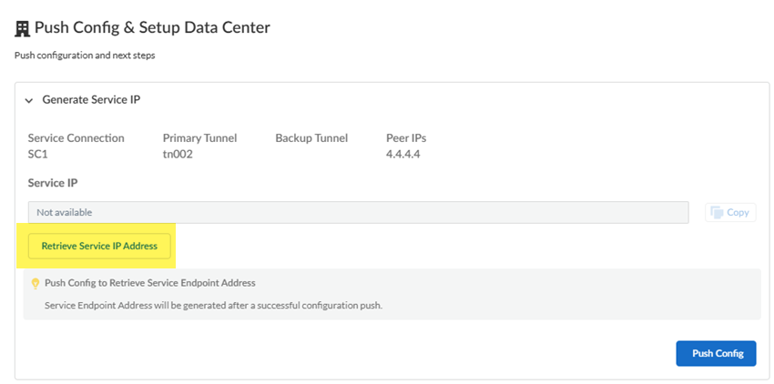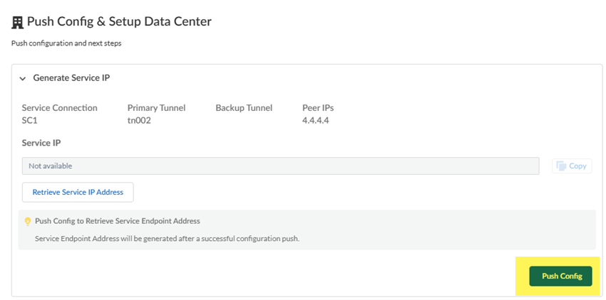 Set up your data center or HQ to complete the service connection.- Copy the Service IP Address and configure the tunnel or tunnels from your CPE on your corporate network back to Prisma Access.Commit the changes on your CPE.Verify your connection by going to ConfigurationPrisma Access SetupService Connections.