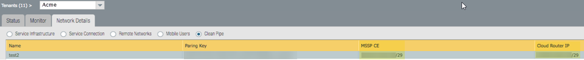 - Status—The operational status of the connection between Prisma Access and the clean pipe instance.