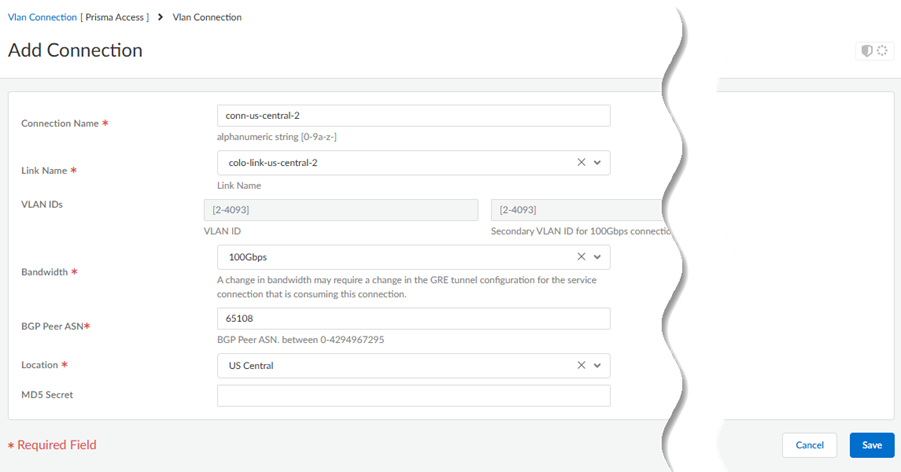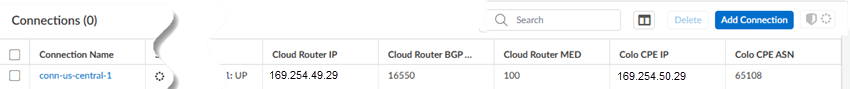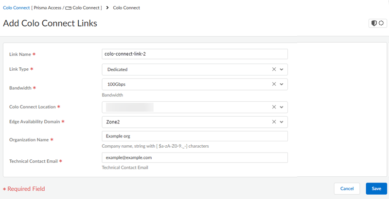 Add a second link with a different Edge Availability Domain.Create the connections (also known as the VLAN attachments) for Colo-Connect.- Go to PanoramaCloud ServicesConfigurationColo-ConnectOnboarding and Add a new connection.Configure the connection settings.