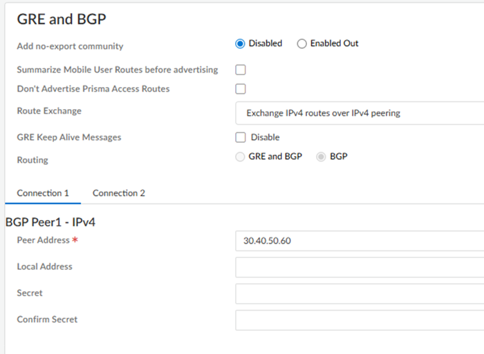 Set up routing for the service connection.From Strata Cloud Manager, return to ConfigurationNGFW and Prisma AccessConfiguration ScopePrisma AccessService Connection.Connections that have 50 Gbps of throughput or more don't require GRE tunnel configuration. If GRE tunnels are required, enter a GRE Tunnel Name 1 and a Peer IP 1 for Connection 1. If you require a bandwidth between 10 Gbps and 20 Gbps, enter a GRE Tunnel Name 2 and Peer IP 2 for the second tunnel for Connection 1; then, create a GRE tunnel for Connection 2 by repeating these steps.For the Peer IP, enter the address that will be used as the GRE local IP address of the on-premises router in the Colo.Use IPv4 addresses for the BGP values; IPv6 isn't supported.Enter the Peer Address and, optionally, the Local Address for Connection 1 and, if required, Connection 2.Whether or not you need to add a GRE tunnel name depends on the bandwidth of your deployment.(Optional) To configure a BGP secret, enter the Secret and Confirm Secret values.
