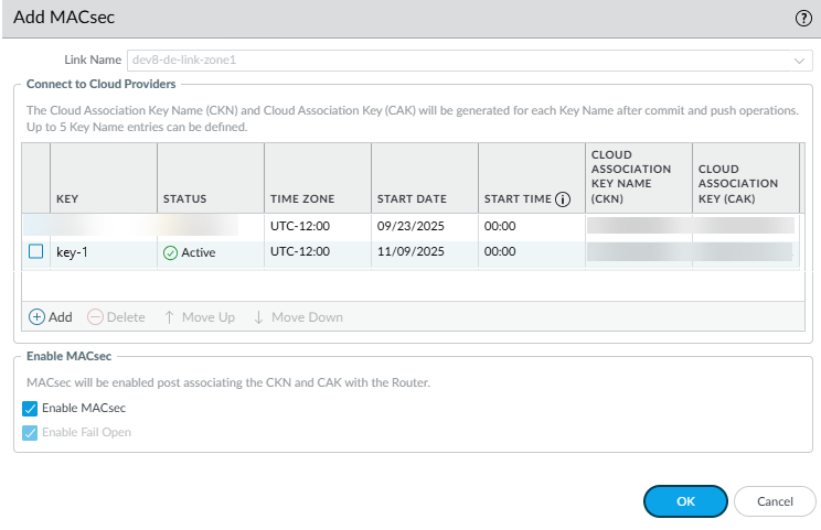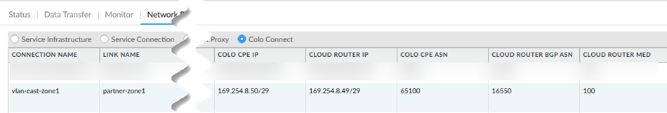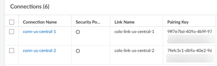 (Optional) If tunnels are used, check the status of the tunnels in the Tunnel area.Check the connection details, including the Pairing Key or keys, of the Colo-Connect connections by going to ConfigurationColo Connect.Configure Prisma Access Colo-Connect—Deployments Using Dedicated Interconnects