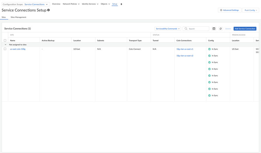 Create a second connection.Both connections must be in the same region and one connection each must be in a separate zone. You use these connections in service connections you create in a later step.Push Config.Configure eBGP routing on the customer router.You need to set up BGP peering to ensure connectivity between the customer router.Set up the service connections to use with Colo-Connect.Commit and Push your configuration changes, making sure that Colo-Connect is selected in the Push Scope.Check the status of Colo-Connect connections and service connections.- To check the status of a service connection used by a Colo-Connect connection, go to ConfigurationNGFW and Prisma AccessConfiguration ScopePrisma AccessService Connections.