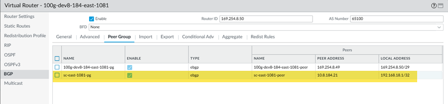Configure the Colo router IP address (Colo CPE IP) as the local eBGP IP address and Configure the cloud router IP address (Cloud Router IP) as the eBGP peer address on your Colo router.If you're using a next-generation firewall as the Colo router, go to NetworkVirtual Routers, Add a virtual router, go to BGPPeer Group, and enter the Colo CPE IP as the Local Address and the Cloud Router IP as the Peer Address.