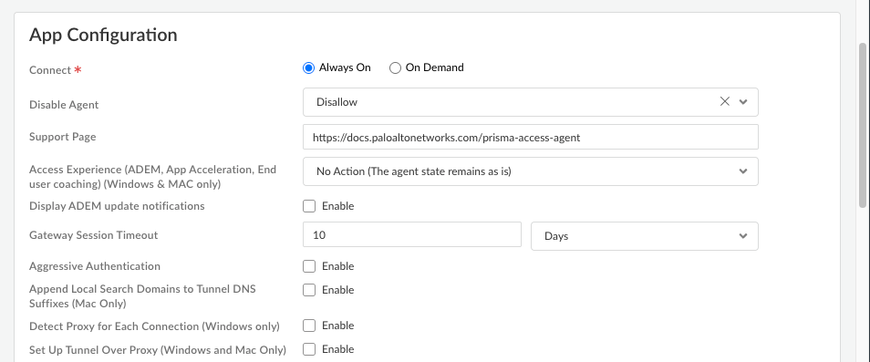 • Support Page—Enter the website that users can access for assistance when they click Support Resources in the Prisma Access Agent.