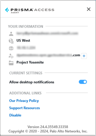 The project you're signed in to.To receive Prisma Access Agent notifications in the menu bar (on macOS) or taskbar (on Windows), Allow desktop notifications. This setting is enabled by default.The desktop notifications will adhere to any "do not disturb" settings that you set at the time of installation. The operating system will prompt you to allow notifications from Prisma Access Agent at the time of installation.To understand what data Prisma Access Agent collects and how the information is used, view Our Privacy Policy.To get assistance on issues that you might encounter with Prisma Access Agent, click Support Resources.If your administrator permits it, you can Sign Out of Prisma Access Agent.If you administrator enabled the feature, you can Disable the Prisma Access Agent so that you can switch to the GlobalProtect app (if it is installed on your device).View the version of your Prisma Access Agent.To close the window, click the X.