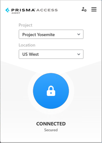 After successfully logging in, you’re connected automatically to the best available Prisma Access location. If you signed in using a project, you are connected to the best available location for your project.