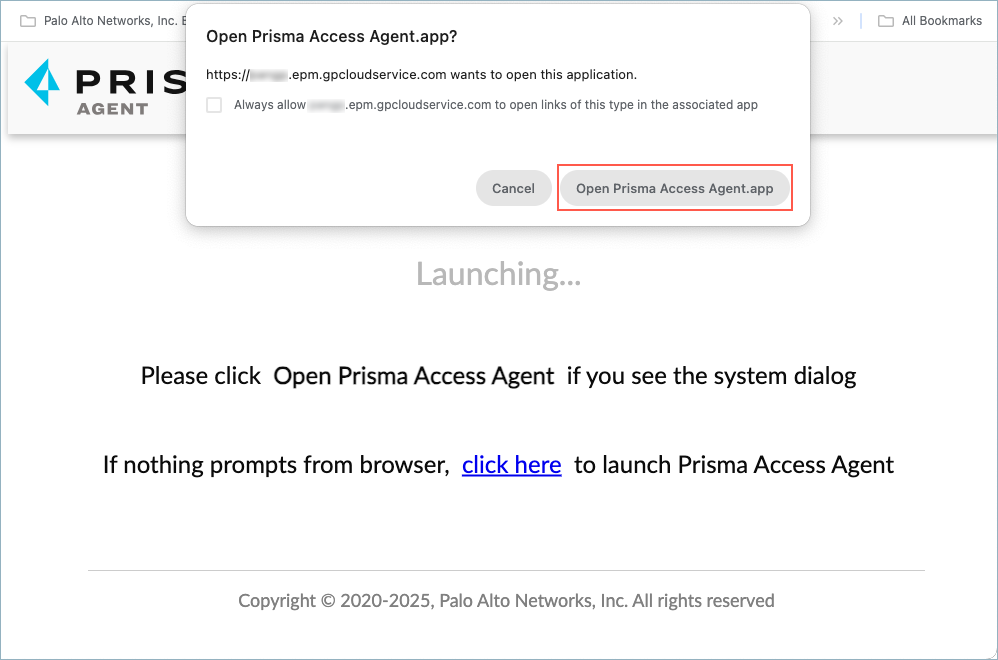 In the login page that appears in your default web browser, sign in to your organization's single sign-on (SSO) app, such as Okta or Azure Active Directory (AD), by entering your login credentials for your organization.If your administrator enabled multi-factor authentication (MFA), you’ll need to complete additional verification in the browser when you log in.When your web browser prompts you, click Open Prisma Access Agent.(Optional) If you don’t want the browser to prompt you the next time you log in, select Always allow <site> to open these types of links in the associated app, then click Open Prisma Access Agent (if supported by your default web browser).