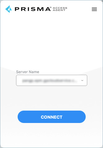 Select the Server Name of the Prisma Access server that your administrator provided and click Connect.The format of the server name is <xxx>.epm.gpcloudservice.com (without the https:// protocol). The maximum length of the server name is 256 characters.