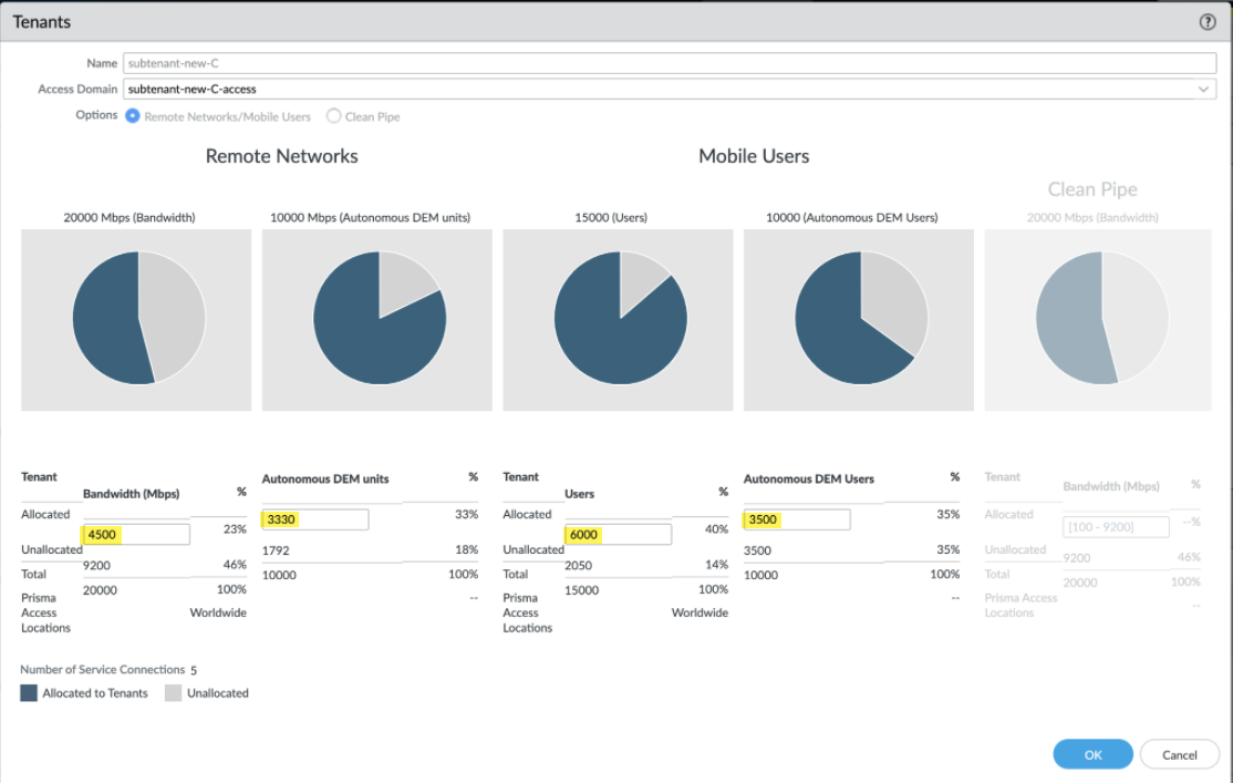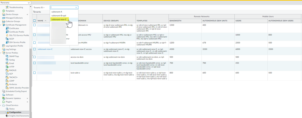 - Select PanoramaCloud ServicesConfiguration, then Add a new tenant.Be sure that you select Remote Networks/Mobile Users; to create and configure a Clean Pipe deployment, see Prisma Access for Clean Pipe.Specify a descriptive Name for the tenant.Add a new Access Domain, give it a descriptive Name, and click OK to return to the Tenants window.After you click OK, Prisma Access automatically creates templates, template stacks, and device groups and associates them to the access domain you create.Specify the amount of Bandwidth (Mbps) to allocate for the Remote Networks and the number of Users to allocate for the Mobile Users.(Deployments with Autonomous DEM Only) If you have purchased an Autonomous DEM (ADEM) license, select the number of units to allocate for ADEM.Use the following guidelines when allocating ADEM units for a tenant: