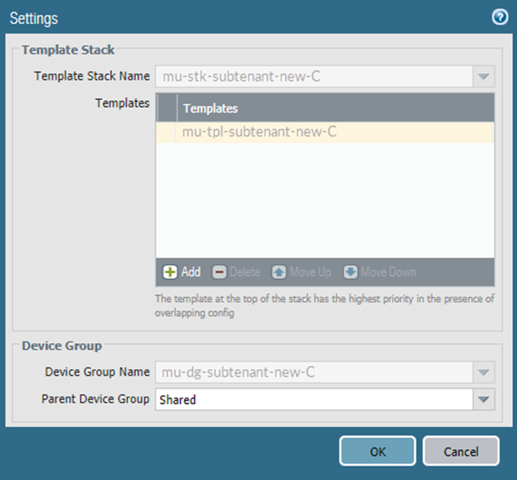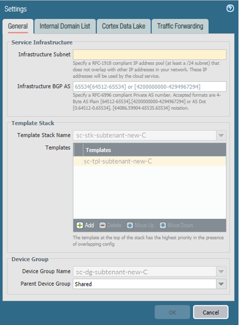 Select PanoramaCloud ServicesConfigurationService Setup.Click the gear icon to the right of the Settings area to edit the settings.Make sure that Prisma Access has associated the template stack (sc-stk-tenant), template (sc-tpl-tenant), and device group (sc-dg-tenant) to your service connection settings.Make sure that the Parent Device Group is set to Shared and click OK.