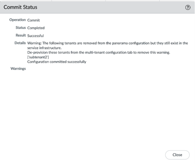 Commit your changes locally to Panorama by selecting CommitCommit to Panorama and Commit your changes.After the local commit, the tenants are marked for deletion and are removed from the list of tenants, but are not deleted from the Prisma Access infrastructure. A pop-up displays showing the tenants that are deleted.