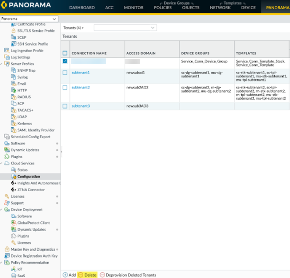 - From the Panorama that manages Prisma Access, select PanoramaCloud ServicesConfiguration.Select the tenant, and delete all configuration associated with it.Perform this step as a best practice to make sure that all configuration is deleted from the tenant, including any Service Connection, Mobile User, Remote Network, or Clean Pipe configuration.Commit and Push your changes to Prisma Access.