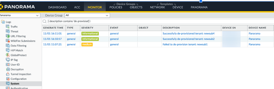 (Optional) Check the status of the deprovisioning operation by going to MonitorLogsSystem. The deprovisioning operation and the name of the tenant is displayed in the logs.
