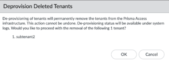 (Optional) To completely remove the tenants from the Prisma Access infrastructure, Deprovision Deleted Tenants.Deprovisioning a tenant:- Removes it from your configuration and the Prisma Access infrastructure, and you cannot retrieve it.
