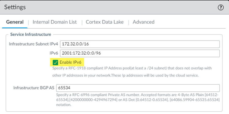 - Select PanoramaCloud ServicesConfigurationService Setup and click the gear icon to edit the Settings.On the General tab, select Enable IPv6.Enabling or disabling IPv6 results in a brief traffic interruption (up to 120 seconds) while the dataplane prepares to accept or reject IPv6 routes on the Prisma Access backbone. Palo Alto Networks recommends that you commit this configuration change during a maintenance window or during off-peak hours.If you need to delete IPv6, delete all configuration (including for mobile users, remote network, and service connections as applicable) before deselecting the Enable IPv6 check box.