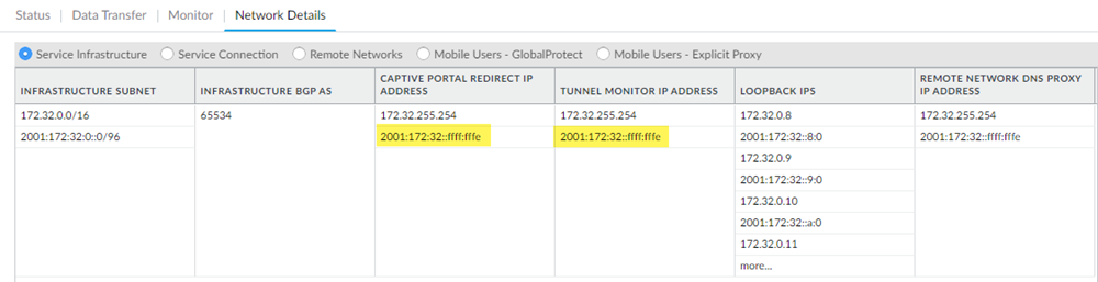 Commit and Push your changes.Select PanoramaCloud ServicesStatusNetwork DetailsService Infrastructure and make a note of the following IPv6 addresses:- Captive Portal Redirect IP Addresses—Used with Authentication Portal-based User-ID address mapping