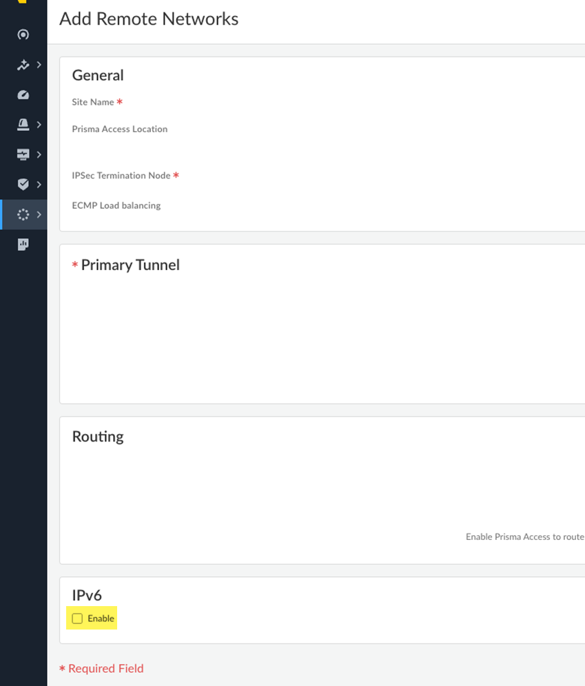 Enable IPv6 networking in a Prisma Access remote network deployment.