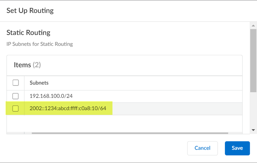 Add a new remote network connection or select an existing remote network connection to edit it.Set up IPv6 routing for your remote network.- (Static Routing Deployments Only) Enter one or more Corporate Subnets in the Static Routes tab.