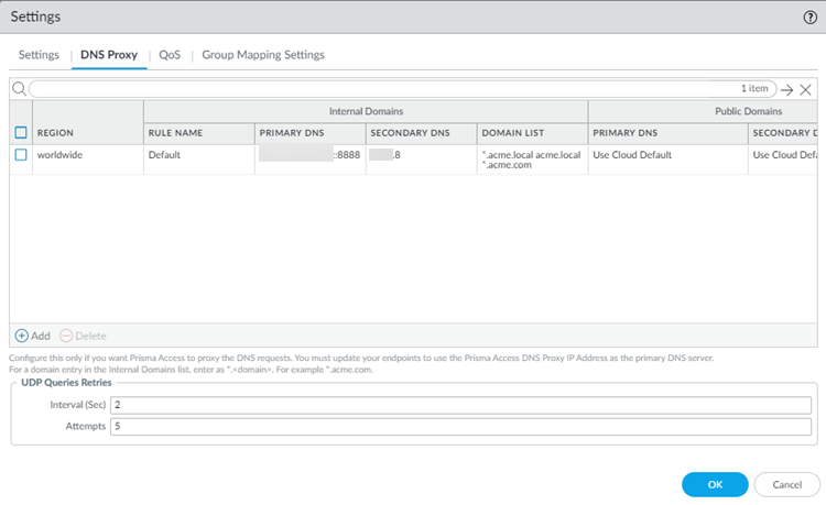 (Optional) If your internal DNS servers use are reachable by IPv6 addresses, select PanoramaCloud ServicesConfigurationRemote NetworkSettings, click the gear icon to edit the settings, select the DNS Proxy tab, Add a rule or specify the default rule, and specify Custom DNS Server IPv6 addresses for the Primary DNS and Secondary DNS server.Prisma Access allows you to specify DNS servers to resolve both domains that are internal to your organization and external domains. If you do not specify any settings, Prisma Access does not proxy DNS requests for remote networks. You also need to select a Region.You can enter any combination of IPv4 or IPv6 addresses for primary and secondary DNS servers.IPv4 addresses use A records, while IPv6 addresses use AAAA records. Some DNS servers can perform AAAA DNS lookups over IPv4 transport; therefore, you might not need a server with an IPv6 IP address.
