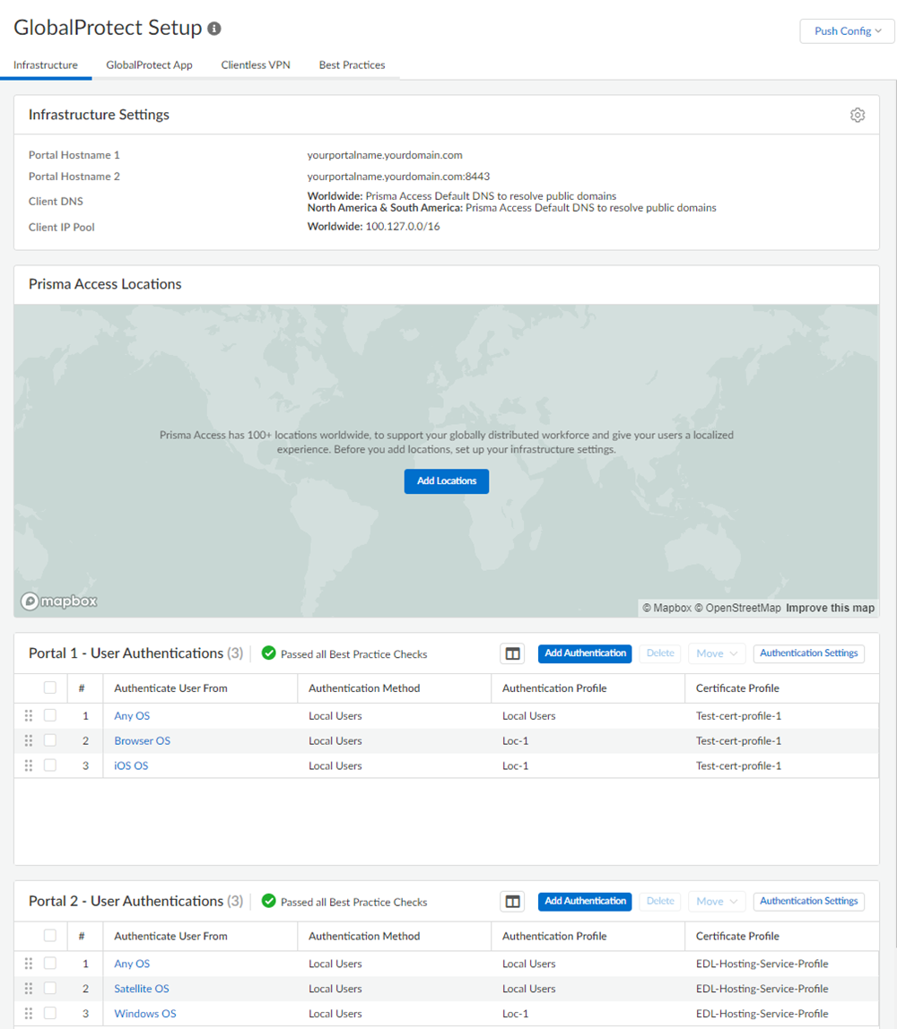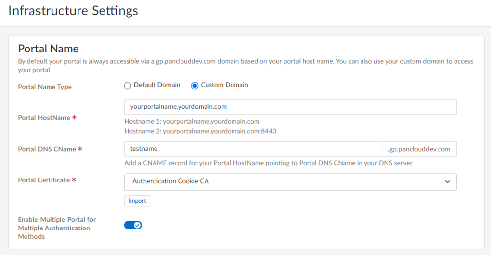 - Select ConfigurationNGFW and Prisma AccessConfiguration ScopePrisma AccessGlobalProtectGlobalProtect SetupInfrastructure.Edit the Infrastructure Settings.Enable Multiple Portal for Multiple Authentication Methods.