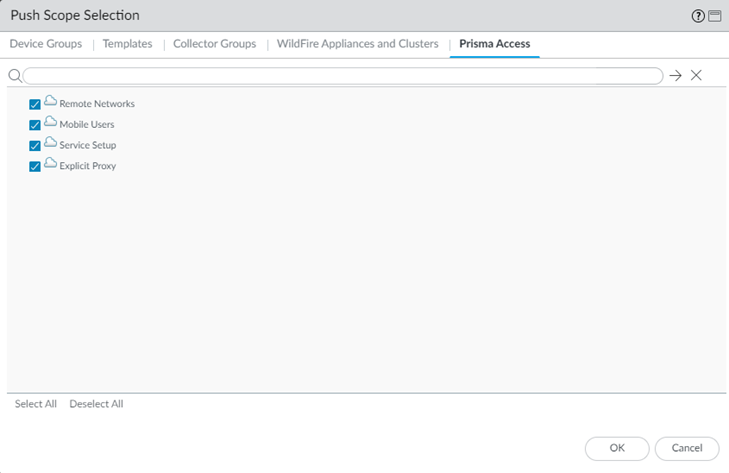Commit all your changes to Panorama and push the configuration changes to Prisma Access.- Click CommitCommit and Push.Edit Selections and, in the Prisma Access tab, make sure that Mobile Users is selected in the Push Scope, then click OK.