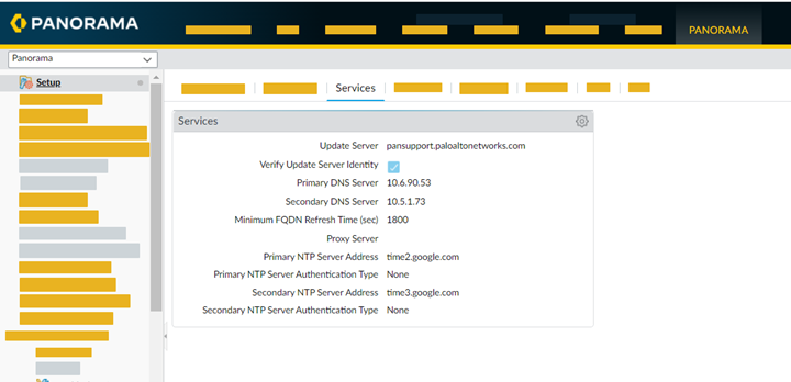 Copy the key data to a file in the following format and save the file with .key extension.key "ddns-gp" { algorithm hmac-sha256; secret "wCJKVYUtQt644eVOWnowgw=="; };You upload this key to Prisma Access Cloud Services plugin in a later step.In your Prisma Access deployment, specify your DNS server as the primary DNS server.- Select PanoramaSetupServices.Edit the settings and update the primary DNS server details.