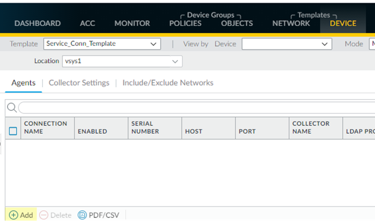Configure a data redistribution agent that redistributes quarantine list information from the service connections to Panorama.- From the Panorama that manages Prisma Access, select PanoramaCloud ServicesStatusNetwork DetailsService Connection.Make a note of the User-ID Agent Address (PanoramaCloud ServicesStatusNetwork DetailsService ConnectionUser-ID Agent Address) for each service connection.Select PanoramaData RedistributionAgents.Add a Data Redistribution agent, give it a Name and select Enabled.Enter the User-ID Agent Address of the service connection as the Host and 5007 as the Port.Make sure that your network does not block access to this port between Panorama and Prisma Access.(Optional) If you have configured this service connection as a Collector (DeviceData RedistributionCollector Settings), enter the Collector Name and Collector Pre-Shared KeySelect Quarantine List; then, click OK.