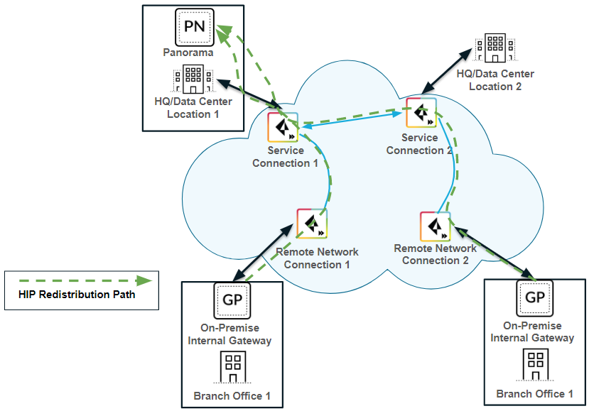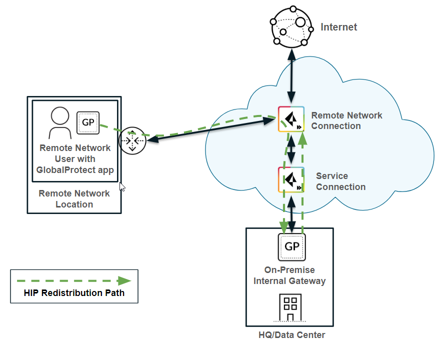 Alternatively, you can configure each internal firewall or gateway in your enterprise to directly collect HIP information from Prisma Access, without using Panorama as a central location, by creating a User-ID Agent in each device. Note, however, that Prisma Access uses service connections to send HIP information, and service connection bandwidth consumption might increase if Prisma Access sends a large number of HIP reports. - HIP redistribution from a user at a remote network to Prisma Access—The previous use cases showed Prisma Access collecting HIP information from mobile users. If you want to apply HIP-based policies in Prisma Access for a user at a remote network location, you need a way to distribute the HIP information from the remote network user’s GlobalProtect app to Prisma Access.The following example shows a user at a remote network location whose internet access is located on the remote network connection. In Prisma Access, you control the user’s internet access at the remote network location with security policies created in the Remote_Network_Device_Group or in a shared device group. To properly enforce the policies at the remote network location for the user, you need to configure Prisma Access to retrieve the user’s HIP information from the internal gateway.In this example, the GlobalProtect gateway at the HQ/data center that is configured as an internal gateway using internal host detection checks the user’s HIP information from the user’s GlobalProtect app. The internal gateway detects that the user is inside the remote network location and collects both User-ID and HIP information from the user.To distribute this HIP information from the internal gateway to Prisma Access, create a User-ID agent in Panorama and specify the IP address of the internal gateway as the host.
