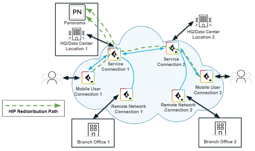 - HIP redistribution from Prisma Access to Panorama—If you have multiple firewalls or gateways in your organization with HIP-based security policies, you can redistribute the HIP information from Prisma Access to the Panorama that manages Prisma Access by creating a User-ID agent in Panorama and specifying the Prisma Access User-ID Agent Address as the User-ID Host. You can then redisribute HIP reports from that Panorama appliance to the other managed Panorama appliances, gateways, firewalls, and virtual systems in your enterprise, using the same workflow that you use to redistribute User-ID information to managed firewalls and enforce consistent policy for internal apps and resources, as shown in the following figure.