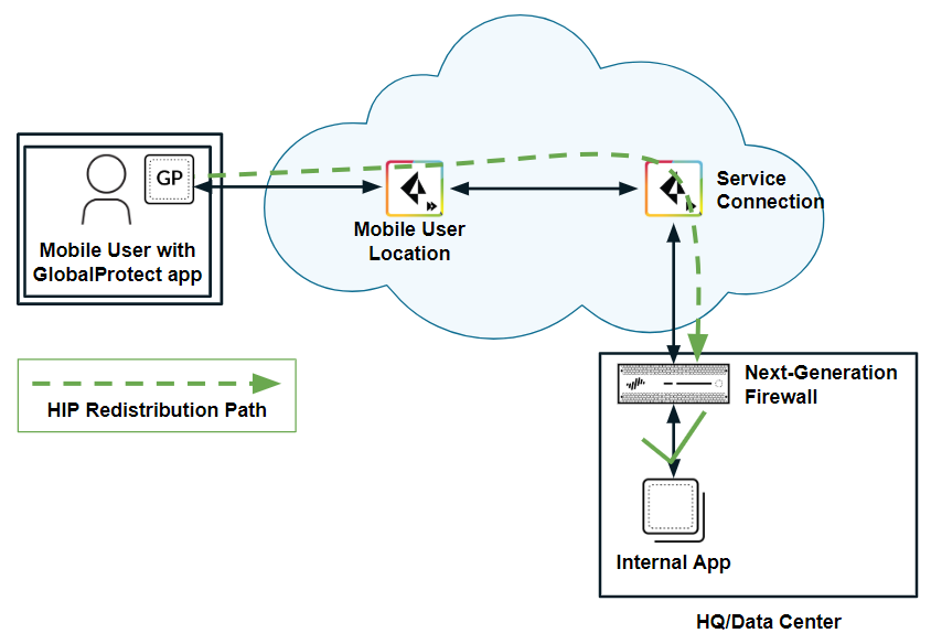 HIP redistribution allows you to distribute the mobile users’ HIP information to the on-premises firewall. The firewall can then check the user’s HIP information against its configured security policies and grant the user access to the app.