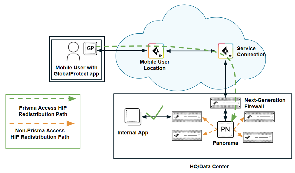 - HIP redistribution from Prisma Access to a next-generation firewall—If you have a next-generation firewall in your organization’s data center or headquarters location, and have configured that firewall with HIP-based security policies, you cannot enforce those policies for Prisma Access mobile users until you redistribute HIP redistribution from Prisma Access to the firewall.The following figure shows a mobile user whose endpoint is protected with the GlobalProtect app. The user attempts to access an internal app at an HQ/data center whose access is controlled by a next-generation firewall with HIP-based security policies. When the user logs in to the GlobalProtect app, the app collects HIP information and sends it to Prisma Access; however, Prisma Access does not redistribute this information to the on-premises firewall. Since the firewall does not have the user’s HIP information, it blocks the user’s access to the app.