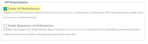 - In Panorama, select PanoramaCloud ServicesConfigurationService Setup.Click the gear icon to edit the settings.In the Advanced tab, select Enable HIP Redistribution.Enabling HIP Redistribution enables Prisma Access to redistribute the HIP reports received from the GlobalProtect app to internal firewalls and to Panorama.