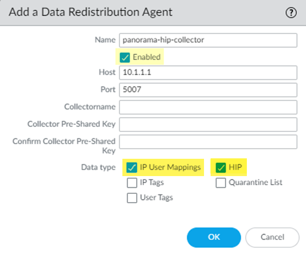 Configure Panorama to collect the User-ID mapping from Prisma Access.- From the Panorama that manages Prisma Access, select PanoramaData RedistributionAgents (for Panorama 10.x appliances) or PanoramaUser IdentificationUser-ID Agents (for 9.1.x Panorama appliances).Add a User-ID Agent and give it a Name.Enter one of the following values in the Host field, depending on the types of HIP information you want to collect.