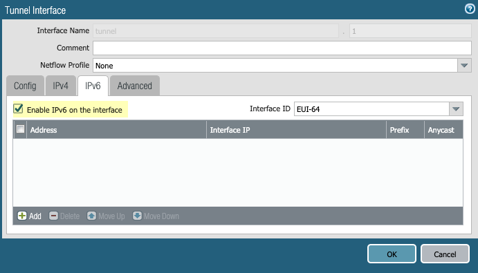 Enable IPv6 on the interface.- Select DeviceInterfaceTunnel and select the tunnel Interface that you use for the mobile user’s traffic.Select IPv6; then, select Enable IPv6 on the interface.