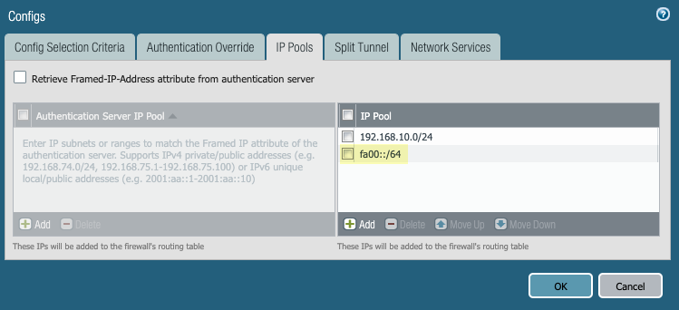 - Add IPv6 IP pools to your GlobalProtect agent configuration.