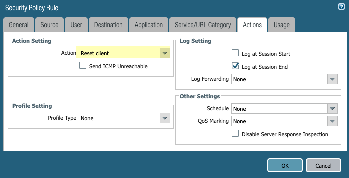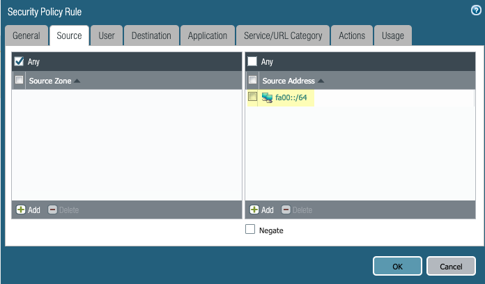 Add a security policy to set a TCP reset action that will terminate sessions with IPv6 source traffic that matches the IP pools you configured in Step 1.- Select PoliciesSecurity and Add a new security policy.Set the Source Address in the rule to match the IP pools you configured in Step 1.