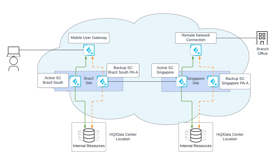 - If there is a single active service connection in a site, Prisma Access selects the backup service connection in that site to route the traffic.