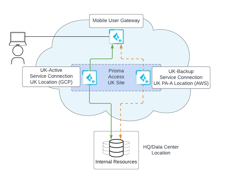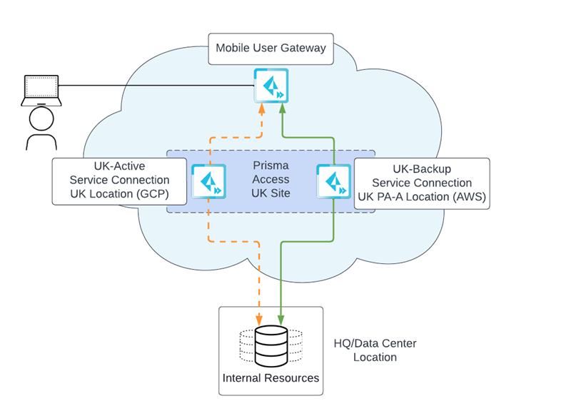 If a GCP outage affects the UK-Active service connection, Prisma Access fails over to the UK-Backup service connection, which is hosted on AWS. In this way, Prisma Access allows mobile users access to the resources at the data center or HQ, even in the event of a cloud provider outage. The following diagram shows the traffic flow.