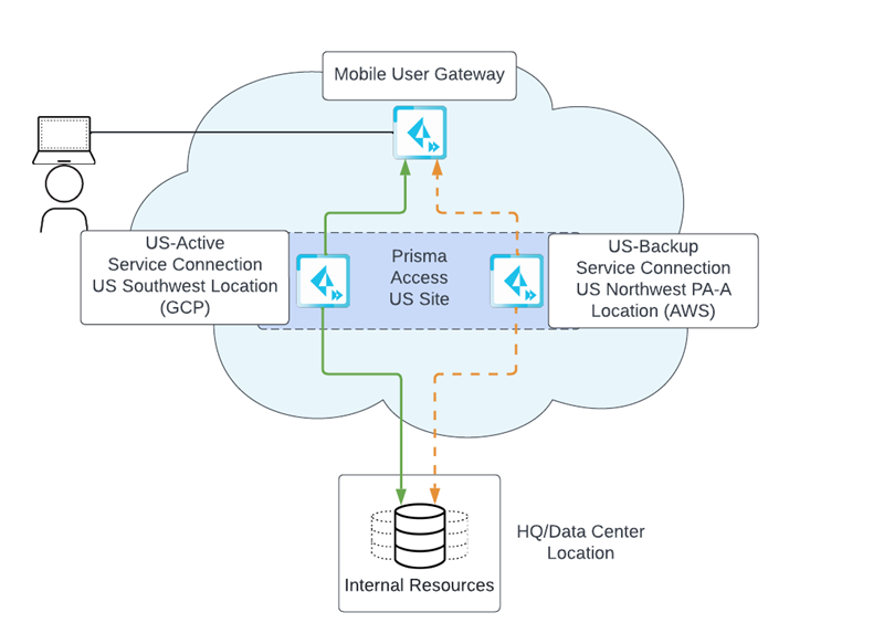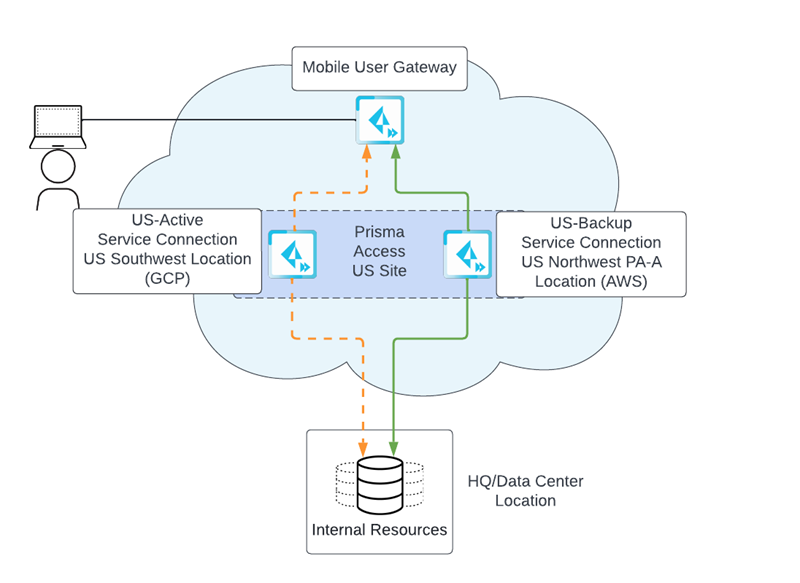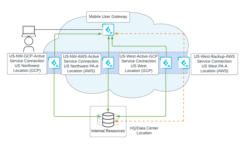 If the US-Active location goes down (either because of a cloud provider or regional outage), the service connection fails over to the US-Backup location, which uses a different cloud provider and compute location from the US-Active service connection, as shown in the following diagram.