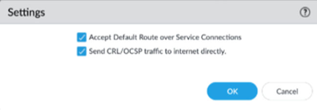 - Onboard your service connections, mobile users and remote networks, as applicable to your deployment.Select PanoramaCloud ServicesConfigurationTraffic Steering.(Optional, mobile user deployments only) Allow Prisma Access to accept and install the default route advertised over one or more service connections from the CPE by clicking the gear icon to open the Settings and selecting Accept Default Route over Service Connections.Default routes have guidelines that you must follow when using them; for example, default routes are supported for mobile user deployments only and have no effect on remote network deployments. Be sure to review these guidelines before implementing default routes with traffic steering.(Optional) Allow Prisma Access to send certificate revocation list (CRL) and Online Certificate Status Protocol (OCSP) traffic directly to the internet by selecting Send CRL/OCSP traffic to internet directly.Select this choice if you have an OCSP or CRP server in the public internet and you want to send that traffic directly to the internet using the untrust zone. If you do not select this choice, Prisma Access sends this traffic to the service connection.Be sure that you have upgraded your Prisma Access deployment to a minimum version of 5.1.1 before selecting Send CRL/OCSP traffic to internet directly.