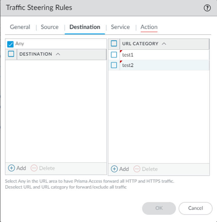 Use the following guidelines when configuring destination options:- If you specify a URL category, Prisma Access only matches HTTP and HTTPS traffic, even when service is set to Any.