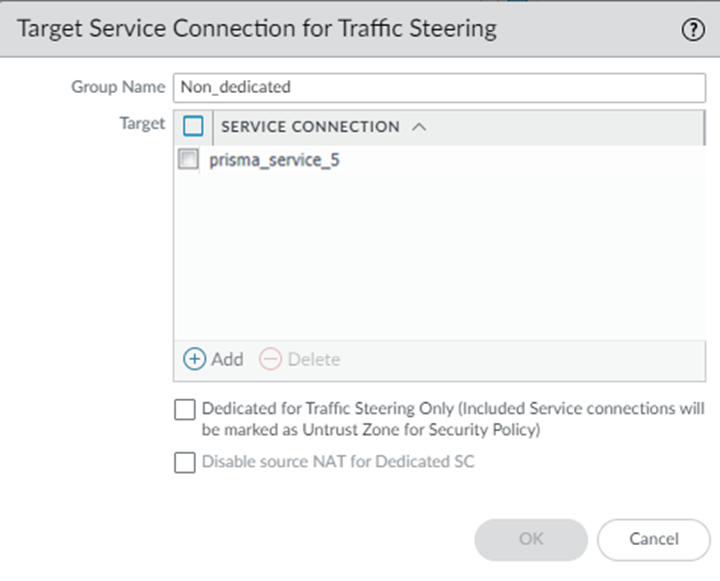 (Optional) Create a target group and assign a service connection to it.- In the Target Service Connections for Traffic Steering area, Add a group and give it a Group Name.Add a Target for the traffic, specifying the Service Connection to use with the target; then, click OK.Palo Alto Networks does not recommend using multiple service connections (whether dedicated or non-dedicated) in a target service connection group that is referenced in a traffic steering rule. In addition, a given service connection can only exist in one target and you cannot add a single service connection to two different targets.Choose whether to make the service connections associated with this target a dedicated service connection.