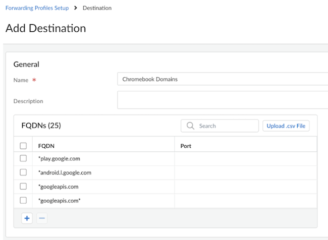 Chromebook with Prisma Access Explicit Proxy (Panorama)Learn how to use a Chromebook with explicit proxy using Panorama.You can manage the PAC file by editing the PAC file directly. Complete the following steps using a PAC file.- Enable explicit proxy.Go to PANORAMACloud ServicesConfigurationExplicit Proxy.Create a new PAC file or if you have an existing PAC file, select the PAC file under PAC FILE URL, and download it.![]() Edit the PAC file and add the following URLs and set them as DIRECT.if (shExpMatch(host, "*play.google.com") || shExpMatch(host, "*android.l.google.com") || shExpMatch(host, "*googleapis.com") || shExpMatch(host, "*googleapis.com*") || shExpMatch(host, "*android.com") || shExpMatch(host, "*android.clients.google.com") || shExpMatch(host, "*apps.chrome") || shExpMatch(host, "*googletagmanager.com") || shExpMatch(host, "*withgoogle.com") || shExpMatch(host, "*google-analytics.com") || shExpMatch(host, "*googleusercontent.com") || shExpMatch(host, "*dns.google") || shExpMatch(host, "*android.apis.google.com") || shExpMatch(host, "*safebrowsing.google") || shExpMatch(host, "*gvt1.com") || shExpMatch(host, "*gvt2.com") || shExpMatch(host, "*apps.chrome") || shExpMatch(host, "*sites.google.com") || shExpMatch(host, "*ogs.google.com") || shExpMatch(host, "*m.google.com") | shExpMatch(host, "*contacts.google.com") || shExpMatch(host, "*accounts.google.com") || shExpMatch(host, "*mail.google.com") || shExpMatch(host, "*www.google.com") || shExpMatch(host, "*appengine.google.com") ) { return "DIRECT"; }Select the CONNECTION NAME. Under Proxy Auto Configuration, Browse the edited PAC file and click OK. Edit the PAC file and add the following URLs and set them as DIRECT.if (shExpMatch(host, "*play.google.com") || shExpMatch(host, "*android.l.google.com") || shExpMatch(host, "*googleapis.com") || shExpMatch(host, "*googleapis.com*") || shExpMatch(host, "*android.com") || shExpMatch(host, "*android.clients.google.com") || shExpMatch(host, "*apps.chrome") || shExpMatch(host, "*googletagmanager.com") || shExpMatch(host, "*withgoogle.com") || shExpMatch(host, "*google-analytics.com") || shExpMatch(host, "*googleusercontent.com") || shExpMatch(host, "*dns.google") || shExpMatch(host, "*android.apis.google.com") || shExpMatch(host, "*safebrowsing.google") || shExpMatch(host, "*gvt1.com") || shExpMatch(host, "*gvt2.com") || shExpMatch(host, "*apps.chrome") || shExpMatch(host, "*sites.google.com") || shExpMatch(host, "*ogs.google.com") || shExpMatch(host, "*m.google.com") | shExpMatch(host, "*contacts.google.com") || shExpMatch(host, "*accounts.google.com") || shExpMatch(host, "*mail.google.com") || shExpMatch(host, "*www.google.com") || shExpMatch(host, "*appengine.google.com") ) { return "DIRECT"; }Select the CONNECTION NAME. Under Proxy Auto Configuration, Browse the edited PAC file and click OK.![]() Commit and push to Explicit_Proxy_Device_Group. Commit and push to Explicit_Proxy_Device_Group.