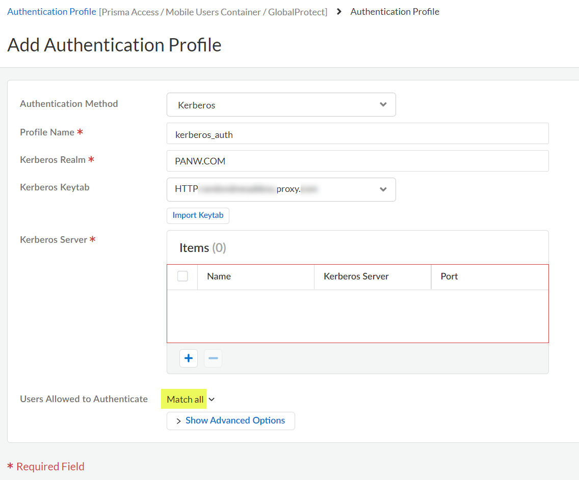 Enter the Profile Name to identify the server profile.The authentication profile specifies the server profile that the portal or gateways use when they authenticate users.Enter the Kerberos Realm (up to 127 characters) to specify the hostname portion of the user login name. For example, the user account name user@EXMP.COM has the realm EXMP.COM.Import the Kerberos Keytab (Import Keytab) youcreated earlier.
